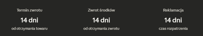 - Zwrot środków nastąpi w ciągu 14 dni od dnia otrzymania przez nas zwróconego towaru lub potwierdzenia jego nadania (w zależności co nastąpi wcześniej).